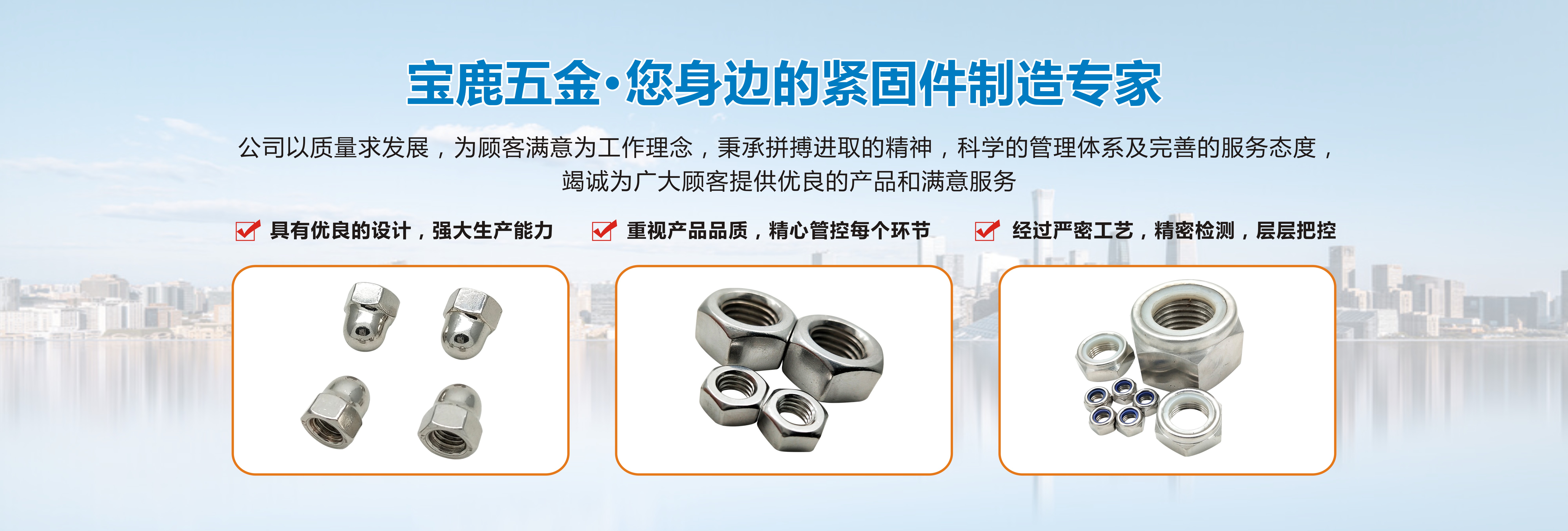 東莞市寶鹿五金有限公司是以生產(chǎn)、銷售不銹鋼緊固件的專業(yè)企業(yè)。產(chǎn)品標(biāo)準(zhǔn)有: 國標(biāo)、美標(biāo)、英標(biāo)、德標(biāo)、日標(biāo)等。主要產(chǎn)品有:不銹鋼外六角、杯頭內(nèi)六角、平頭內(nèi)六角、圓頭內(nèi)六角、機(jī)米螺絲、盤頭機(jī)螺絲、沉頭機(jī)螺絲、盤頭自攻螺絲、沉頭自攻螺絲、 大扁頭機(jī)螺釘、大扁頭自攻螺絲、馬車螺絲以及各種螺母、平墊、彈墊、各種擋圈、介子。生產(chǎn)加工非標(biāo)各種材質(zhì)超長超大螺母、螺桿,304, 31 6化學(xué)錨栓等非標(biāo)加工,防松螺絲定制與加工,精密CNC加工,數(shù)控車床加工件,不銹鋼303,銅,鋁,鐵,塑膠等車件。